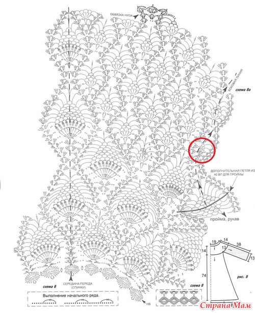Размеры изделия смотрите на рисунке 8. Начните работу с выполнения кокетки из 12 мотивов «ананас». Для этого сделайте наборный ряд арок (см. сх. 8) следующим образом: *12 ВП, отсчитайте от начала цепочки 5-6 ВП и свяжите С2Н*. Для кокетки сделайте 24 арки, замкните вязание соединительной петлей в кольцо и вяжите по кругу согласно схеме 8 а. Провязав в высоту два ряда «ананасов» разделите полотно на спинку (3 мотива), перед (3 мотива) и рукава (по 3 мотива). Продолжите вязание деталей спинки и переда по кругу согласно схеме, сделав прибавки для пройм следующим образом: провяжите после 3 «ананасов» переда с каждой стороны веер из 3 С2Н, 40ВП, 3 С2Н, за счет этого расширяем полотно переда и спинки (по 4 «ананаса»).