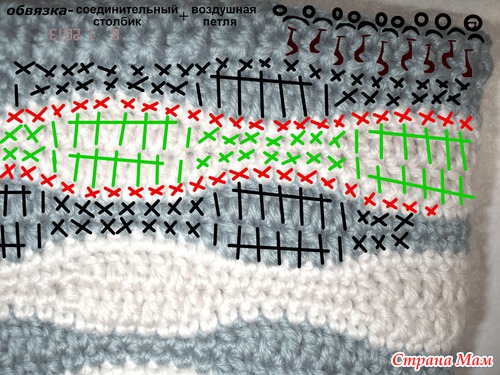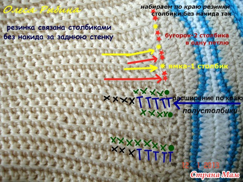Манишку впервые крючком вязала, не очень туго, чтоб жесткой не получилась.Резинка вяжется поперек столбиками без накида за заднюю стенку. Набрала 45 петель(высота воротника будет)вязала такой длины, чтоб в растянутом виде проходила через голову. Еще в конце каждого 5-7 ряда(а лучше в начале)вязала последние 5 столбиков -полустолбиками с накидом(для расширения). Далее соединяем в трубу и вяжем поперек-набираем по краю столбики без накида, вот на схеме указала звездочками красными и желтыми. а далее узором "волны", как на шапке, вязала с прибавлениями. Единственное, прошлась синим цветом по синему соединительными столбиками-получилась косичка между полосами. Обвязка шапки и манишки такая- соединительный столбик и возд. петля. Комплект уже носим, очень довольны. Манишка оказалась удобнее шарфа, все прикрыто, ничего не продувает.