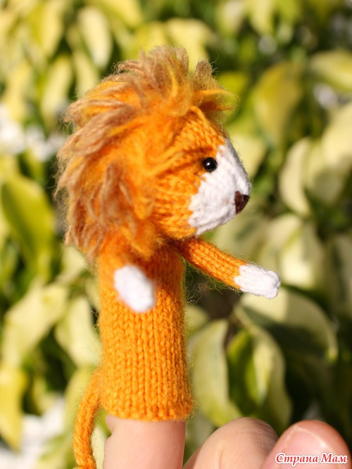 Общий принцип очень простой.. Сначала вяжется пальчик на желаемый размер, потом голова животного, в случае со львом это шарик на затылке и неострый конус на мордочке... Грива сделана по принципу волос у кукок..протягивала в петелечку.. На фотографии не совсем видно, но она, грива, 2хцветная.. ряд оранжевой пряжи, ряд светлокоричневой.. Не знаю, как прикрепить фото в ответ, а то я б вам его еще с боку и сзади показала..