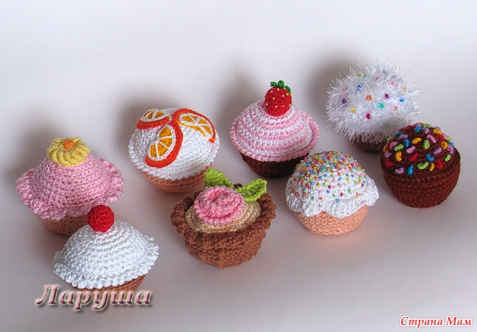 Украсить верхние половинки бисером, бусинами, вышить «посыпку» разноцветной пряжей швом «рококо», делая по 5-6 витков нити. У шоколадного и кокосового кексов соединить половинки крючком столбиками без накида, у кекса с бисерной «посыпкой» пришить верхнюю половинку к нижней. Не забудьте оставить отверстие для набивки, наполните кексик холофайбером, затем зашейте отверстие.