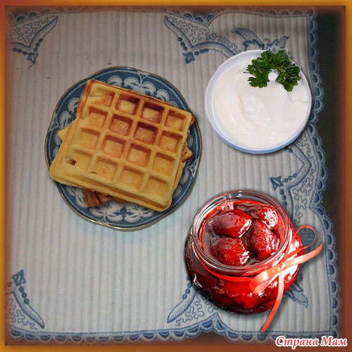 Вафельницу нагреваем. По рецепту форму надо смазывать каждый раз, т. к. могут прилипнуть, я смазывала через раз. Ложим по столовой ложке с горкой на каждую вафельницу и закрываем. Жарим 2-3 мин. и употребляем со сметанкой или вареньем.