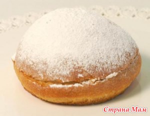 Холодные коржи разрезаем пополам. Затем изнутри пропитываем сиропом. Нанижнюю часть коржа наносим крем, закрываем верхней частью. Обильно посыпаем сахарной пудрой.