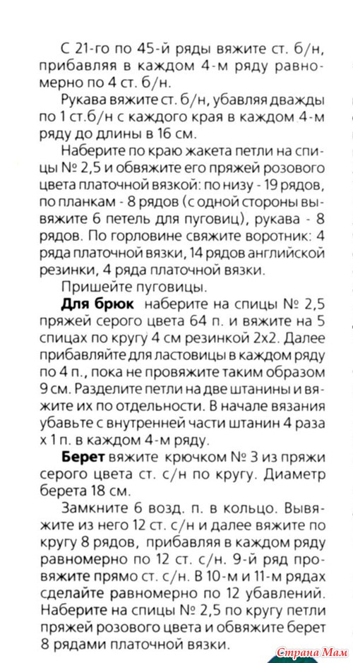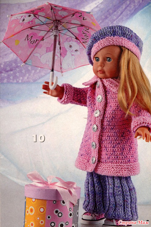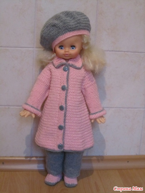 На самом деле не так все сложно. Я упростила, берет весь вязаля крючком, брюки тоже, у пальто не далала обвязку платочной вязкой по низу и рукавам, только рачьим шагом. Пробуйте, должно получиться. Это мой первый наряд для куклы.