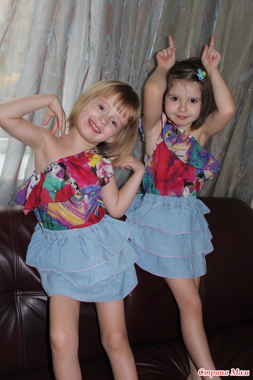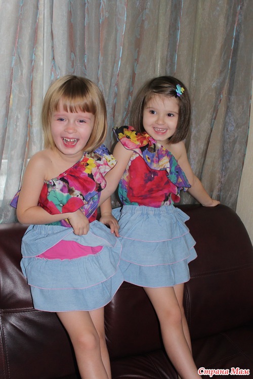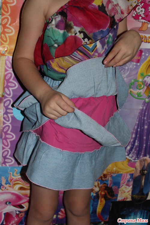 Девчонки просто обожают эти юбки - ведь они с "секретиком" - когда кружишься - цвет меняется на ярко-розовый. (А попросту у меня не хватало ткани на две юбки, и низ я выкроила из ярко-розового хлопка - и опять-же не так жарко и массивно, как если бы из джинсы)