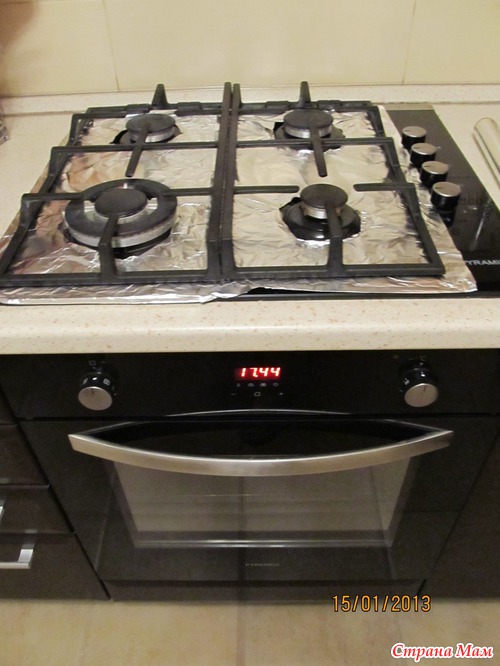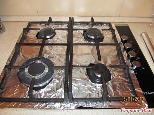 Купили мы новую газовую плиту чёрную, шикарную, фирма PIRAMIDA. Любовалась я ею до первого приготовления, а потом замучилась её драять и вспомнила интересную идею из передачи "Міняю жінку" Решила застелить газовую плиту фольгой, и теперь для идеальной чистоты не нужны моющее средство и по времени-одно мгновение!!!