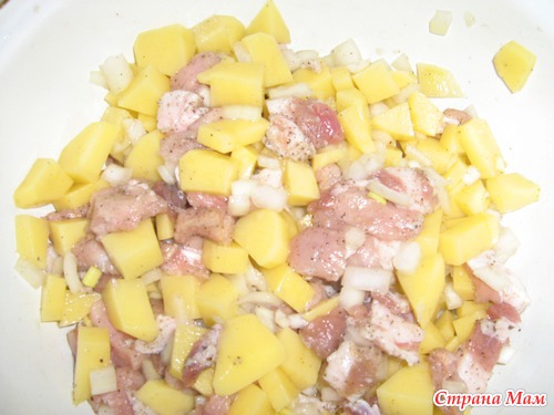 Мясо и картофель нарезала мелкими кубиками, лук тоже мелко. Смешала, посолила, добавила перец.