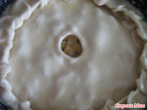 Тесто мысленно делю на 3 части и отрезаю 1/3 - это будет верх пирога. 2/3 теста раскатываю, укладываю в смазанную сливочным маслом форму. И выкладываю на тесто начинку. Затем раскатываю кусочек теста поменьше. Укладываю на начинку. Залепляю края, делаю по середине дырочку и смазываю весь пирог взбитым яйцом.