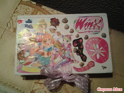 Дальше - дело фантазии. Год назад у меня еще не было акриловых красок, и я красила гуашью, смешанной с ПВА, но акриловыми наверно будет сочнее... Украшали шкатулку мы с дочкой вырезками из журнала, ракушками, клеем с блестками.