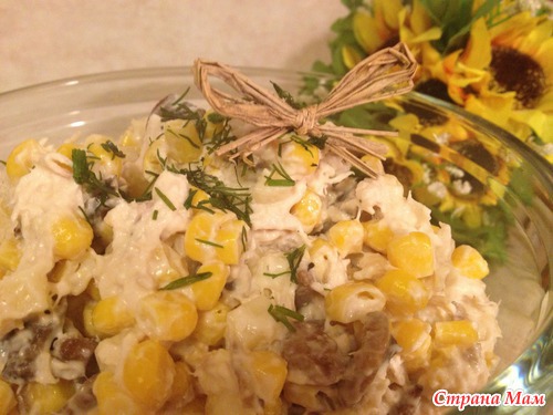 Волокна куринной грудки, кукурузу, жаренные грибы и лук, сыр, все кладем в глубокую миску и заправляем майонезом. Все хорошо перемешиваем.