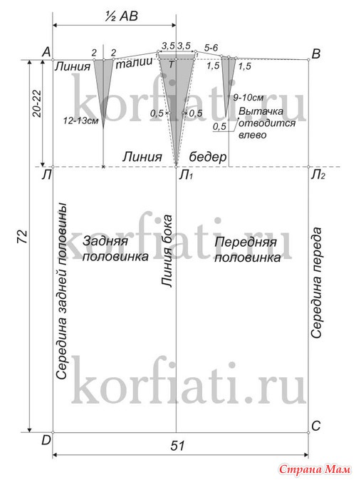 Линия бедер юбки с баской. От точек А, Т, В откладывают вниз по 20-22 сантиметра, ставят точки Л, Л1 и Л2 и соединяют их пунктирной линией.