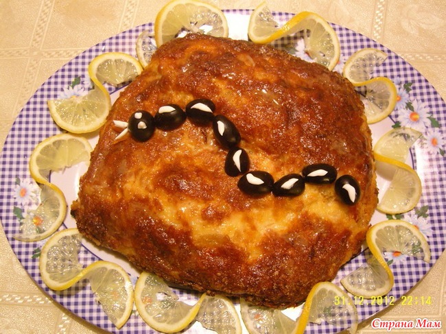 5) Запечь в духовке при 180 градусов 1 час (если сыр уже подрумянился, прикройте фольгой), затем на холод на 12 часов, при подаче сбрызнуть лимонным соком