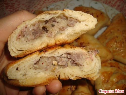 В следующий раз так попробую. Да и много мясо я испугалась класть в начинку думала не испечется и сырой останется, а говорят тут главное много начинки. Ну вощим когда начинку кладети, Те кто еще не испекли ну собираетесь!!! Раскатайте каждый кружок тоньще и начинку по больше! Я так поняла.