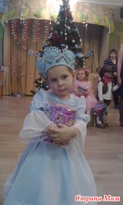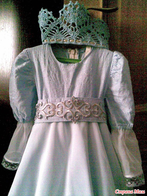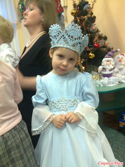 Надо знать мою Кракозяброчку. Она такая хулиганистая, больше на Машу из мультфильма "Маша и Медведь" смахивает. Но заказ поступил - надо выполнять. Я далеко не специалист в области пошива вообще, не то, что костюмов Снегурки. Сижу, думаю. И тут в памяти всплывает с детства врезавшийся момент из фильма "20 лет спустя", где Гундарева многодетную мать играет, и фраза:"А воспитательница сказала, что вечно эти Кругловы в обносках ходят!" И как она потом своё новое платье режет. Слазила, порылась в закромах хомяковских, нашла давно купленную второсортную тканюшку голубого цвета, старую мамину штору тюлевую с кухни, ну и всяких блестяшек нарыла. Потом открыла свою уже полюбившуюся СМ, нашла схему короны крючком. За одну ночь корону связала, за вторую всё остальное. Козявка моя не видела результат моего творчества. Утром муж отвёл её в садик, а я пришла перед началом праздника с чехлом подмышкой.