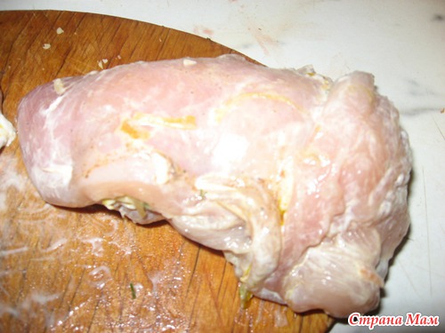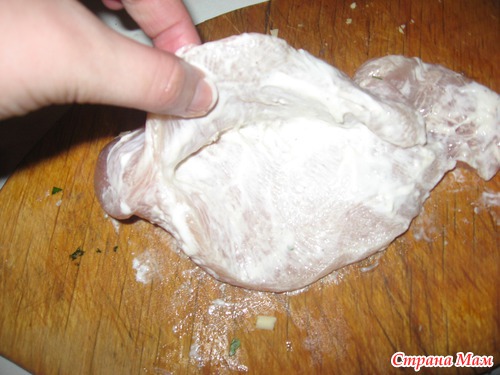 Грудки с одной стороны разрезала, но немного отступив от края и не дорезав до конца - получились кармашки... посолила, поперчила и смазала смесью майонеза и лимона... оставила на сутки (очень хорошо пропитались)...