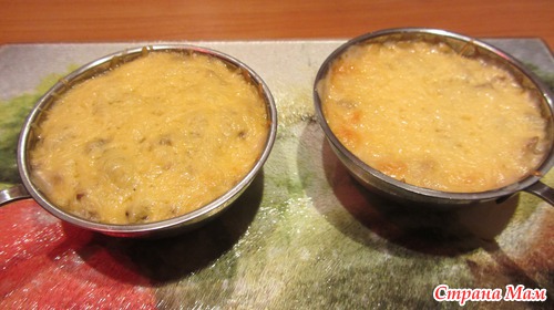 Затем все выкладываем в кокотницы. Если не съедаете сразу.. заготовка упаковывается и помещается в холодильник. А что мы хотим скушать посыпаем тертым сыром и помещаем в духовку заранее разогретую до 200 градусов на 10-15 минут(пока не под румянится сыр)