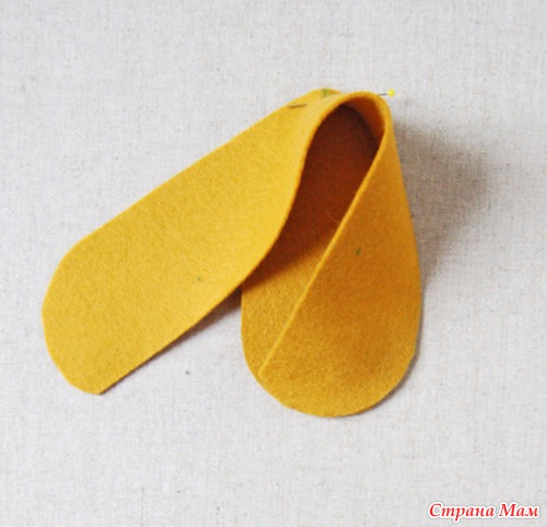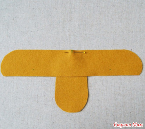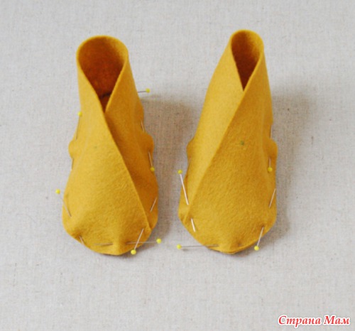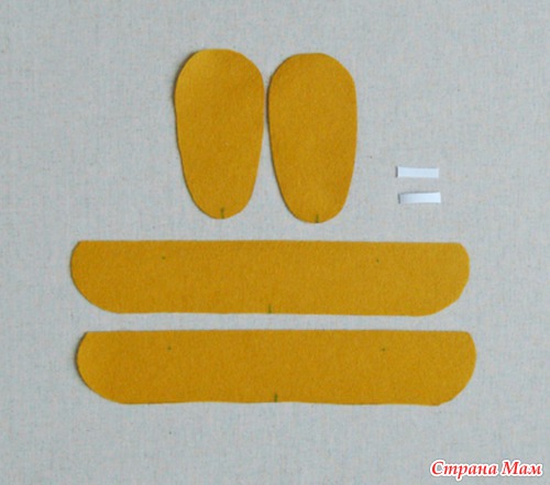 Вырежьте выкройки из войлока. Соедените длиную часть (за середину) с выкройкой стопы (за пятку).