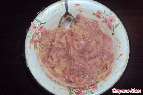 * Фарш на ваш вкус. У меня был куриный, грамм 300. Потёрла туда картофелину среднюю. Накидала стандартный свой набор приправ-соль, перец, хмели-сунели(уважаю очень эту штуку