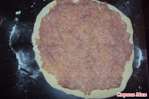 *Раскатала тесто, намазала фаршем.