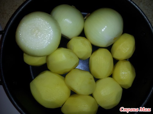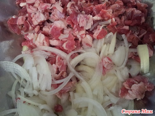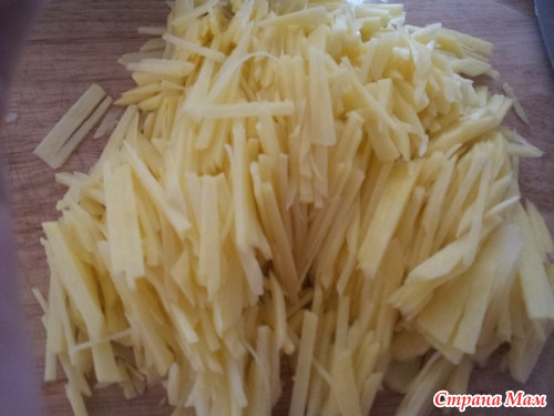 Мясо режим мелкими кусочками лук полукольцами. Картошку соломкой.