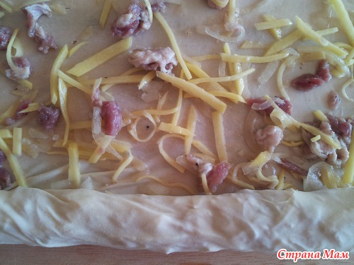 Все перемешать, посолить и поперчить по вкусу. Тесто раскатать тонко, намазать подсолнечным маслом и распределить весь фарш в поверхность тесто.