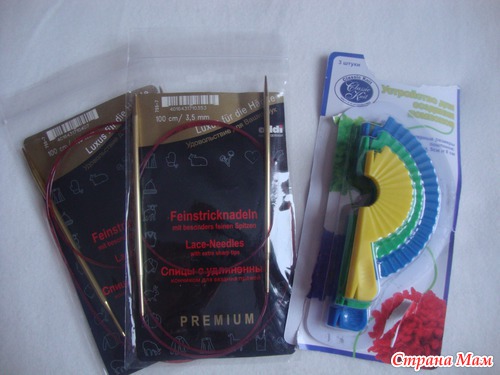 спицы для будущих шалек(мечта!) Адди позолоченные с удлинённым кончиком—просто отличные, я ими резинку к берету вязала. Ну и тут же гвоздь СП —устройство для изготовления помпонов!