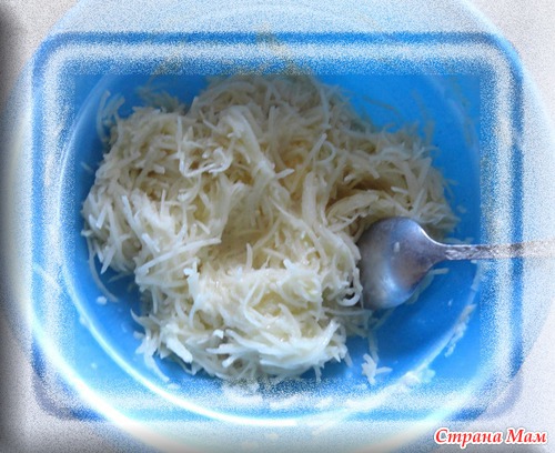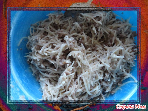На терке или блендером натереть картофель( я его слегка промыла холодной водой) и лук, добавить туда яйца.