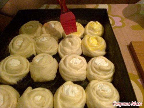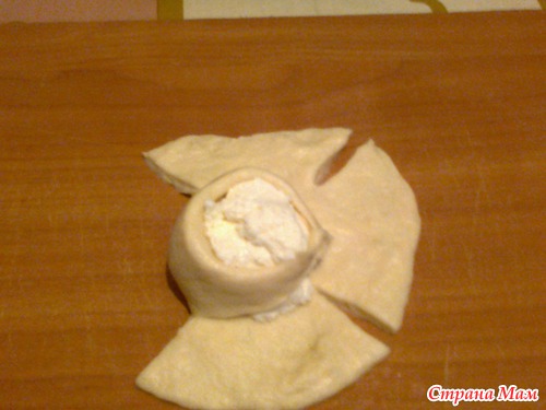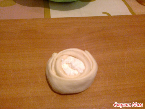 В средину ложим начинкуи начинаем заворачивать розочку.