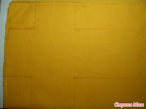 3. Флисовая внутренняя часть. По получившимся размерам чертим исчезающим маркером на флисе заготовку (где стрелочки добавляем по пол сантиметра для того, чтобы было удобно загнуть потом флис на бортики) и вырезаем, при желании можно пришить флисовый кармашек.