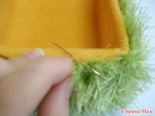 Сначала, тонкой зеленой нитью в цвет травке сшиваем мелкими стежками через край зеленые боковушки между собой, а затем швейной желтой нитью сшиваем потайным швом желтую часть с зеленой: