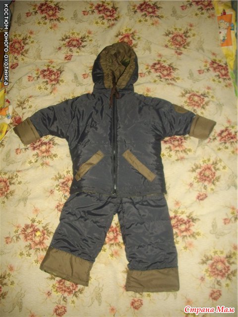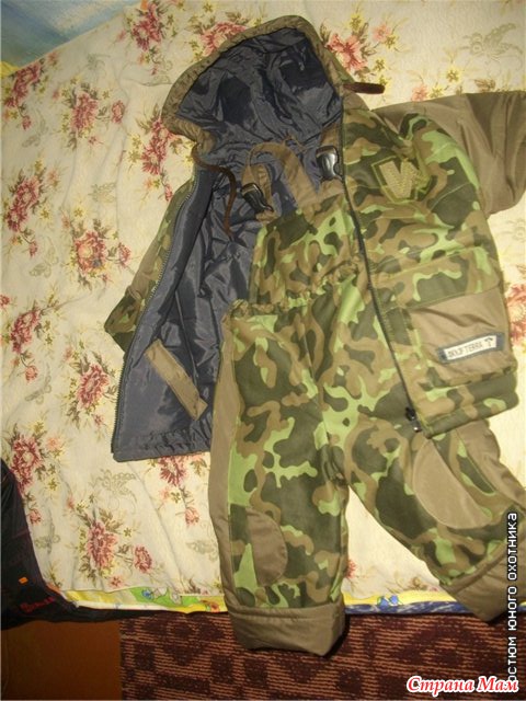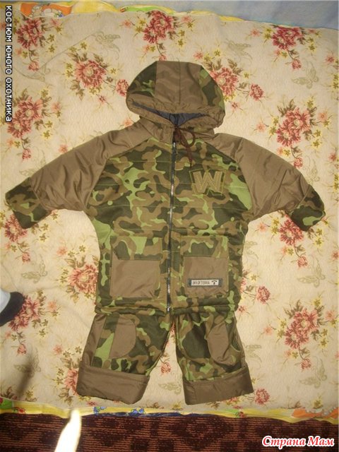 Костюм "Юный охотник" 2-х стороний. ( Из камуфляжной ткани и коричневой плащевки, синий поплин. наполнитель:2-й синтепон.)