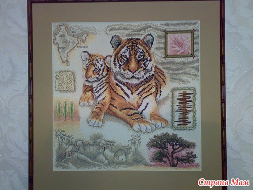 Этим дизайном "заболела" сразу, как только увидала... Особенно "запала" на вышитую карту... Тигры стали моей первой работой, в которой использовалась обшивка и французкие узелки... Проконсультироваться было не с кем... обшивала и мотала узелки так, как сама придумала... Теперь (по прошествии 5 лет) только улыбаюсь, вспоминая свои отчаянные эксперименты...