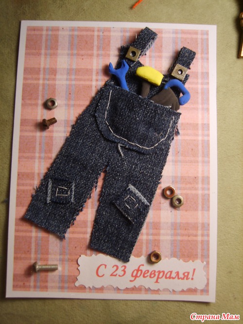 Инструменты на этой открытке выполнены из пластилина iclay, который застывает на воздухе. Слепены заранее, подсушены и помесщены в карманчик.(лучше закрепить "инструменты" капелькой клея.).