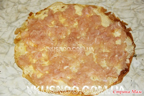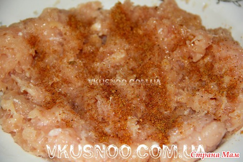 В куриный фарш добавляем соль, перец и специи. Хорошенько отбиваем фарш. Добавляем пару ложек молока или водички. Фарш должен стать слегка жидковат, в дальнейшем мы будем его намазывать на омлет.