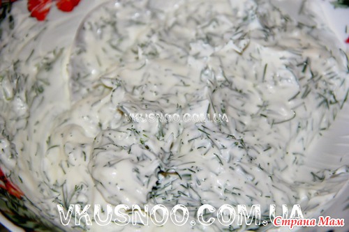 Майонез смешиваем с мелко рубленым укропом. Если хотите то можете заменить майонез на сметану. Но учтите. Если сметана не важного качества, она свернется при большой температуре. Да и майонез сделает наше куриное филе более сочным и нежным.