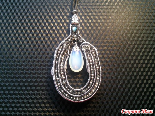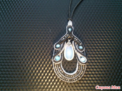 Упражняюсь в технике сутаж. Вот мой очередной кулончик... использовала сутаж черный. серебряный.. прозрачный бисер. в центре лунный камень. и бусинки соколиный глаз