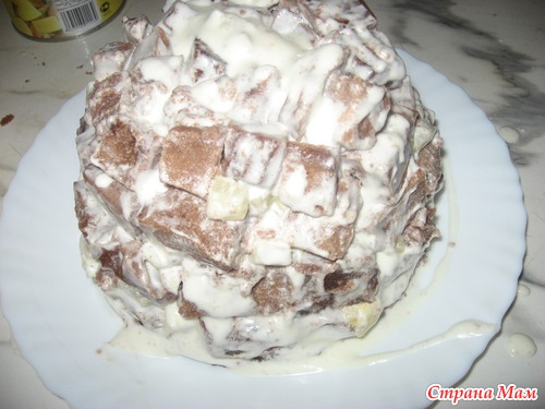 затем, начиная от середины, выкладывать следующий слой - кубики бисквита обмакивать в сметанный крем... посыпать измельченными ананасами...