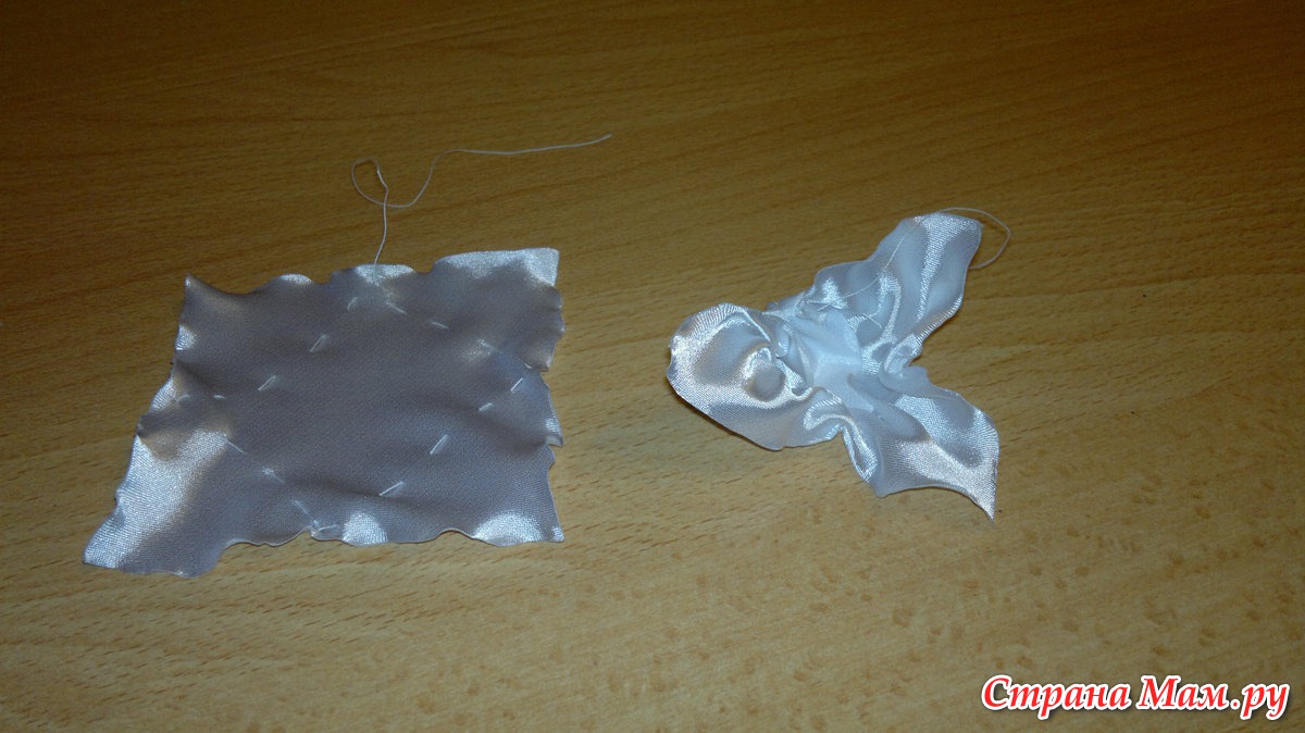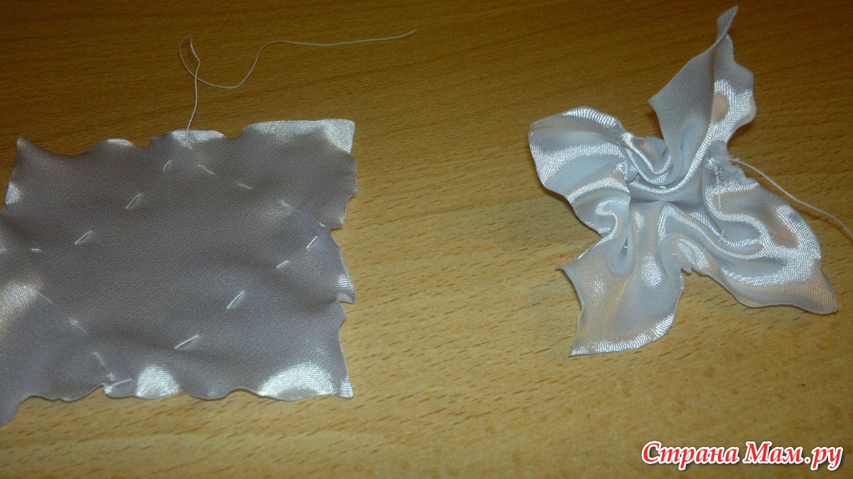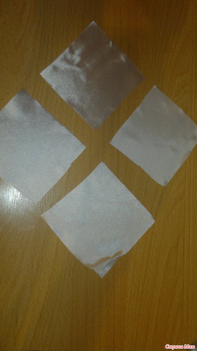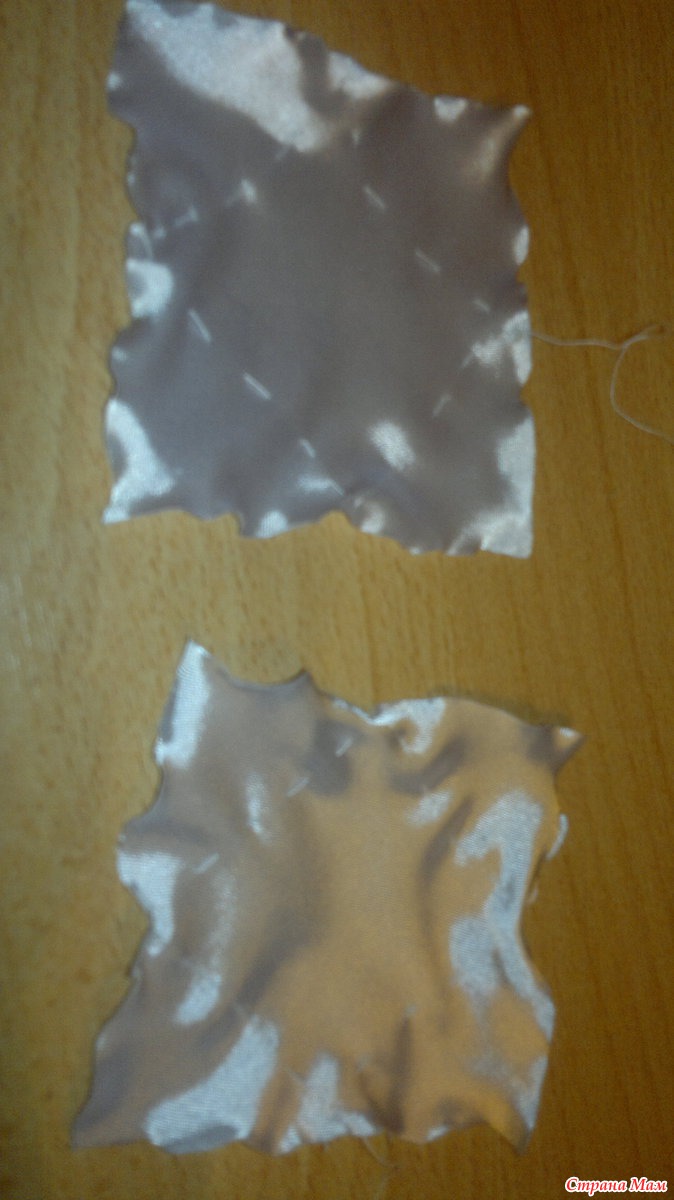 Нарезаем атлас на квадраты нужной величины(у меня примерно 9 см) по косой атласной ткани(края квадратов должны тянуться)На один нарцисс пойдет 2 квадрата.