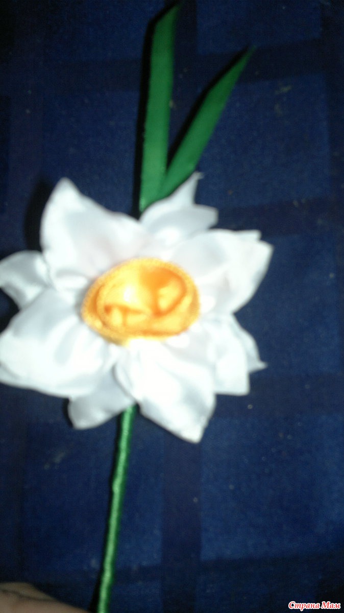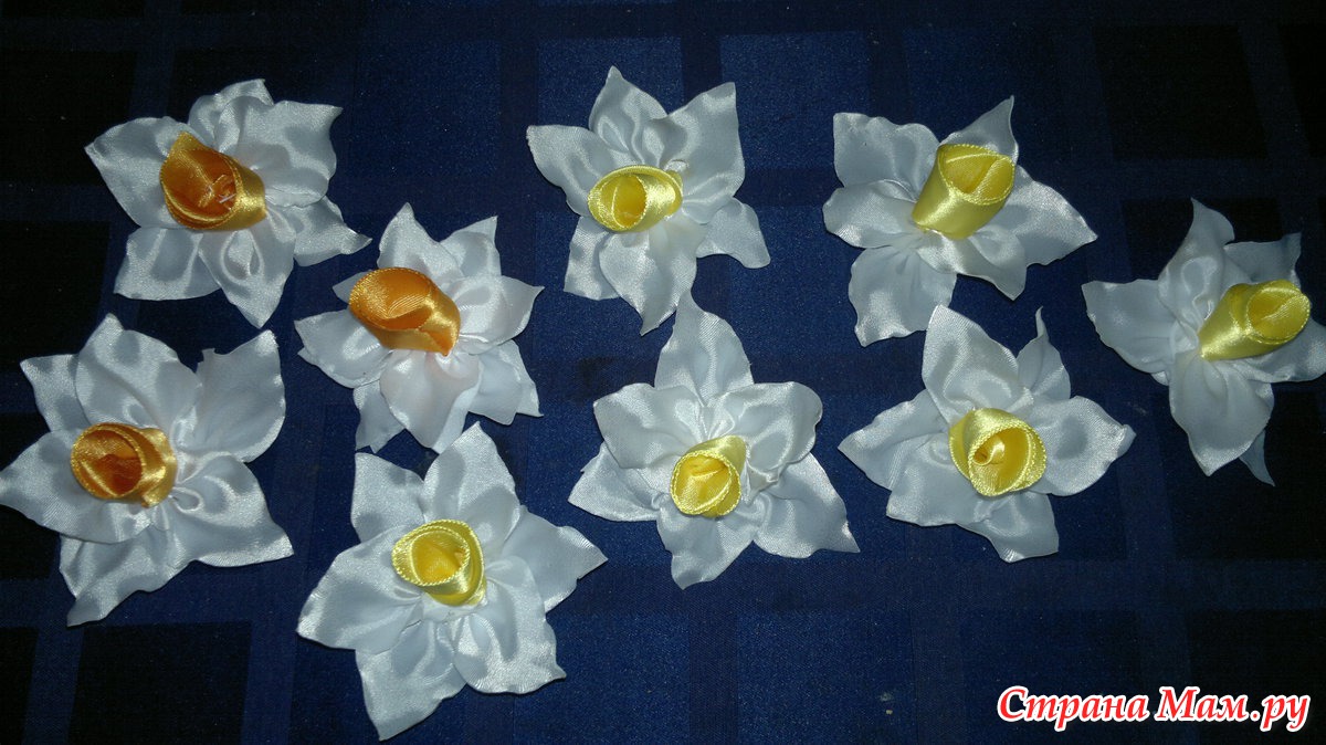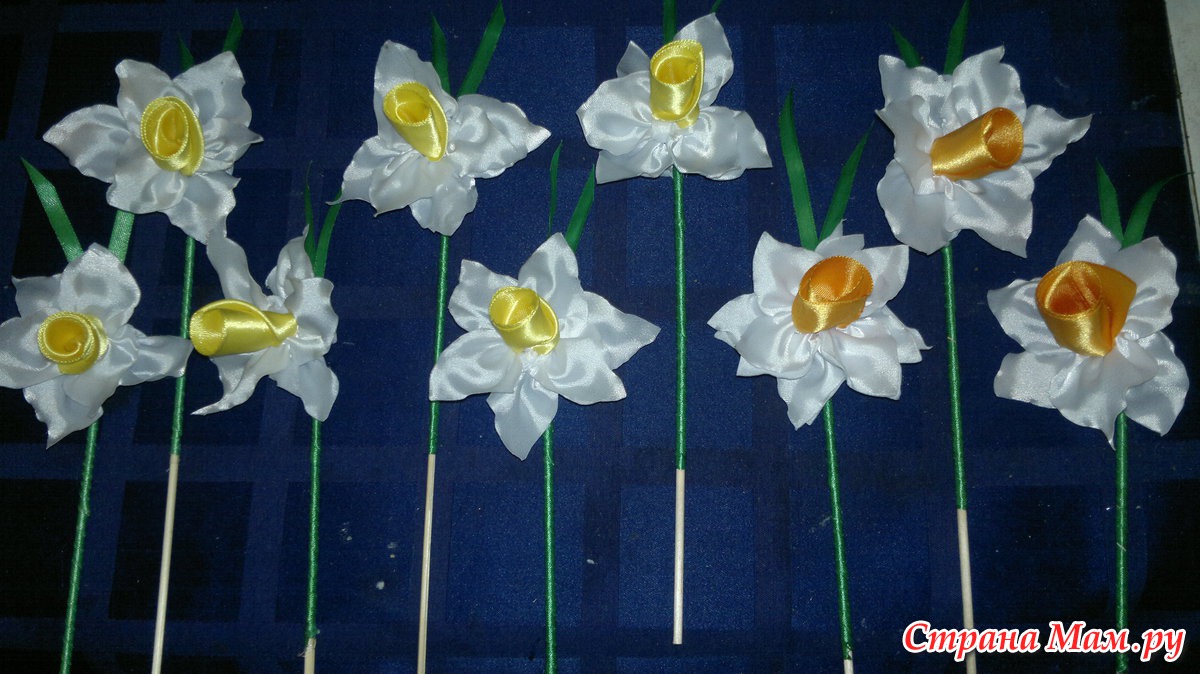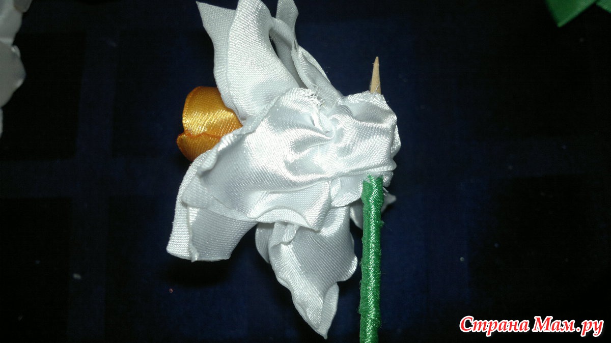 Нашла в интернете изображение по созданию нарциссов, показалось несложным, решила попробовать. Понадобится стрейч-атлас белого цвета(именно стрейч, т. к. края надо будет тянуть), желтая атласная лента, узкая зеленая атласная лента, проволока(или дереаянные шпажки для фруктов) и немного терпения и воображения.