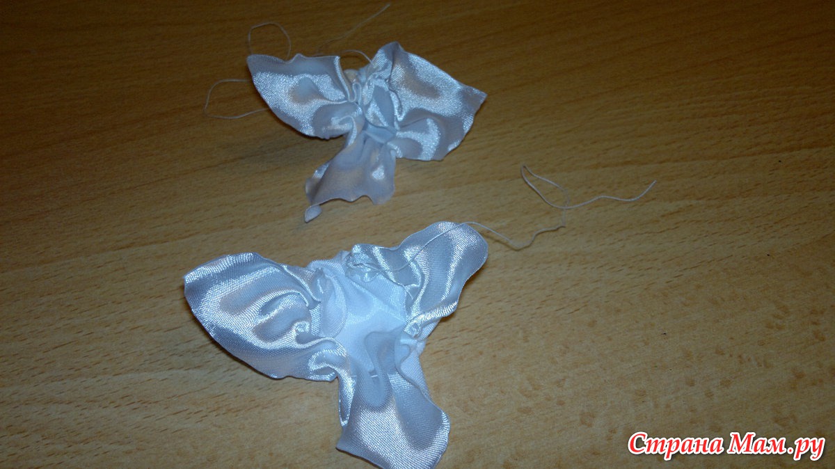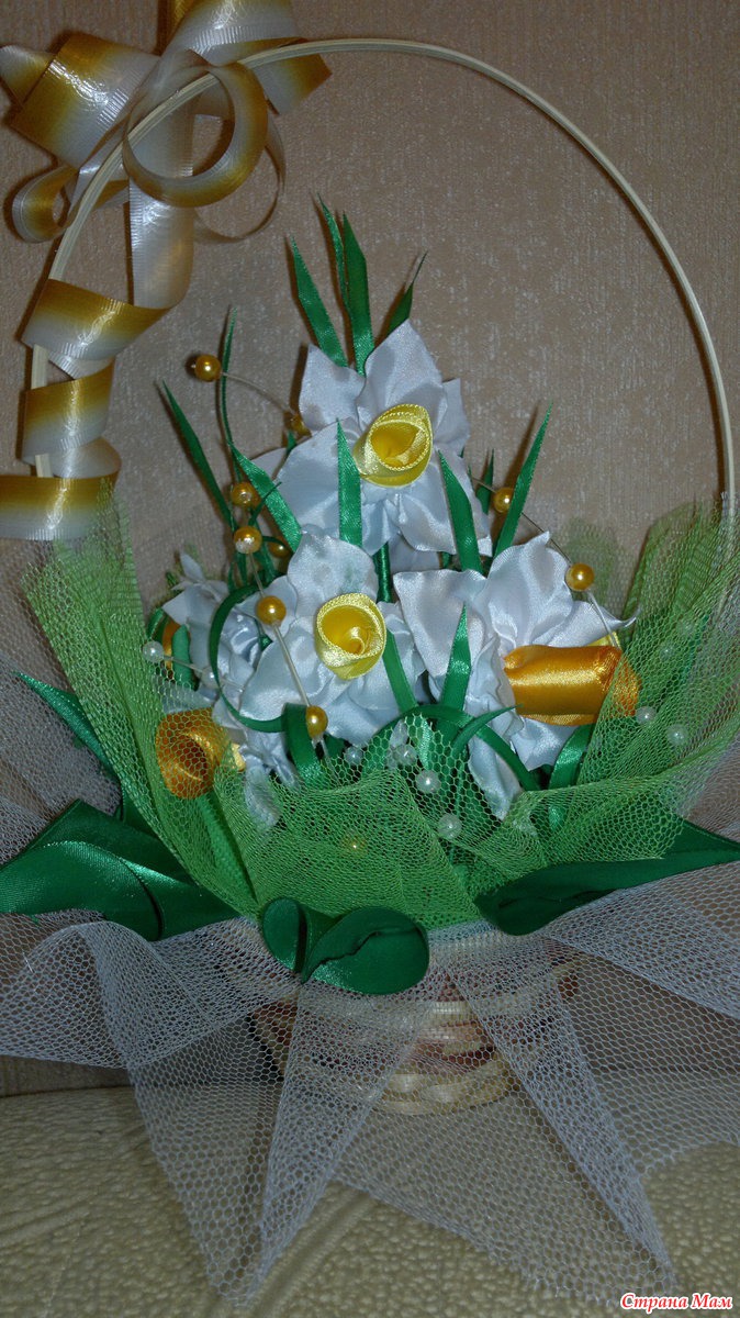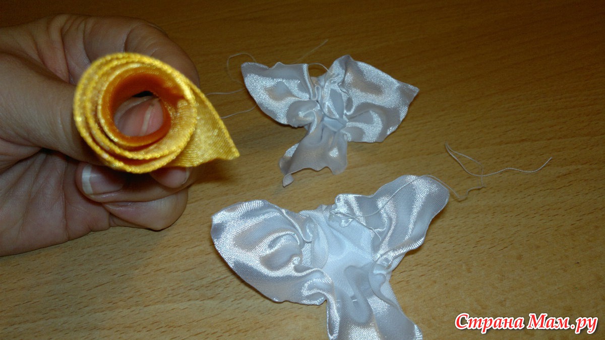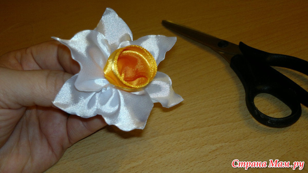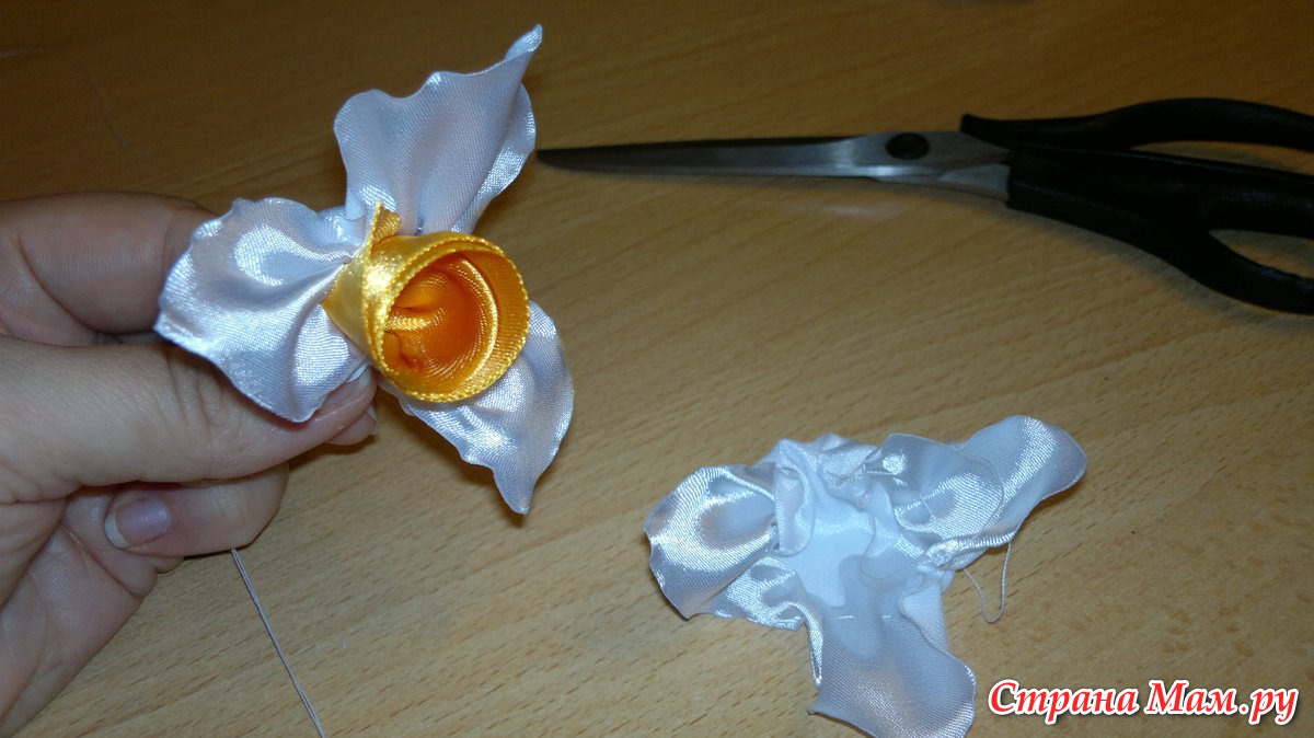 Нашла в интернете изображение по созданию нарциссов, показалось несложным, решила попробовать. Понадобится стрейч-атлас белого цвета(именно стрейч, т. к. края надо будет тянуть), желтая атласная лента, узкая зеленая атласная лента, проволока(или дереаянные шпажки для фруктов) и немного терпения и воображения.