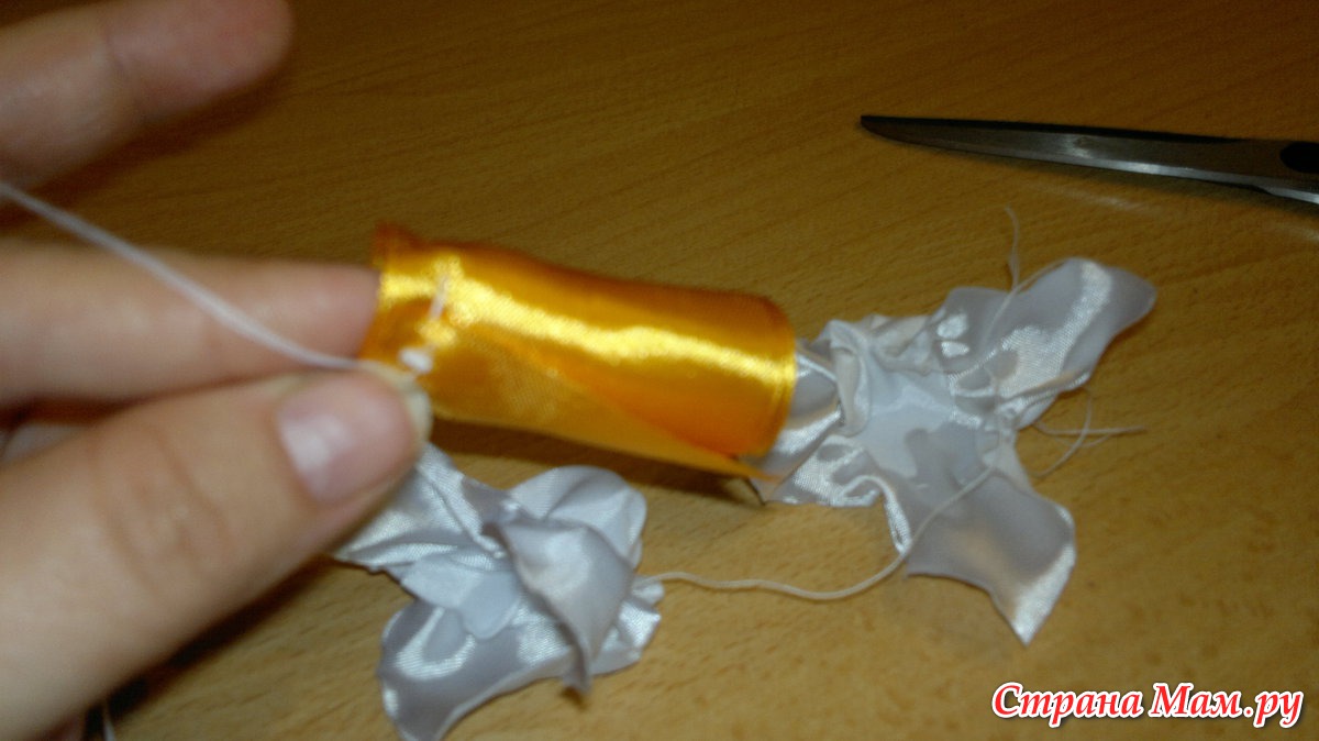 Далее нарезаем атласную ленту для серединки цветка.(примерно 15-20 см.