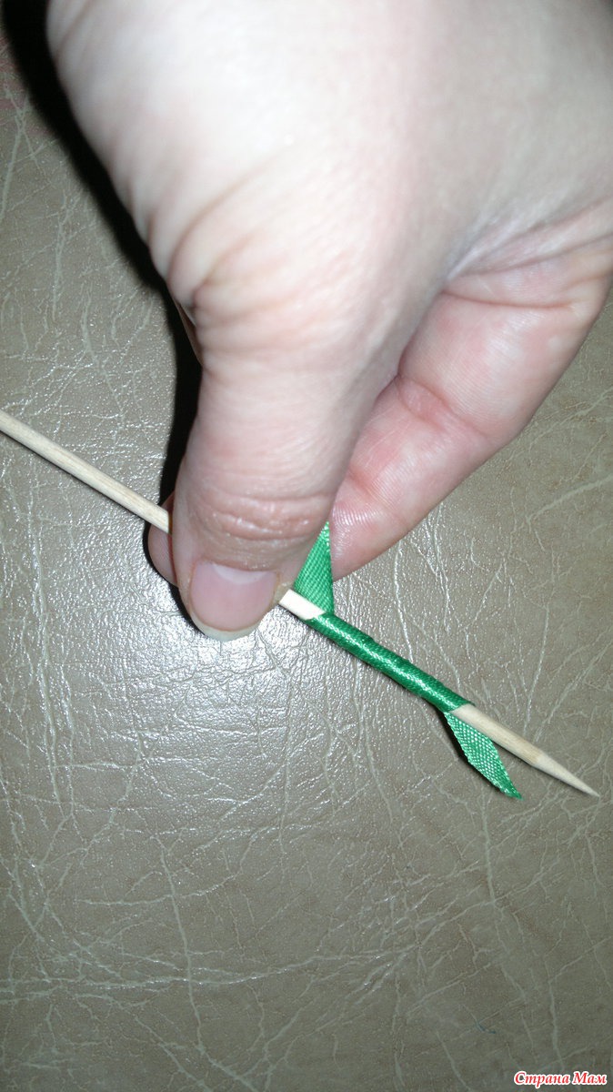 Обматываем шпажку зеленой узкой ленточкой, приклеивая края ленты, чтобы они не распались.
