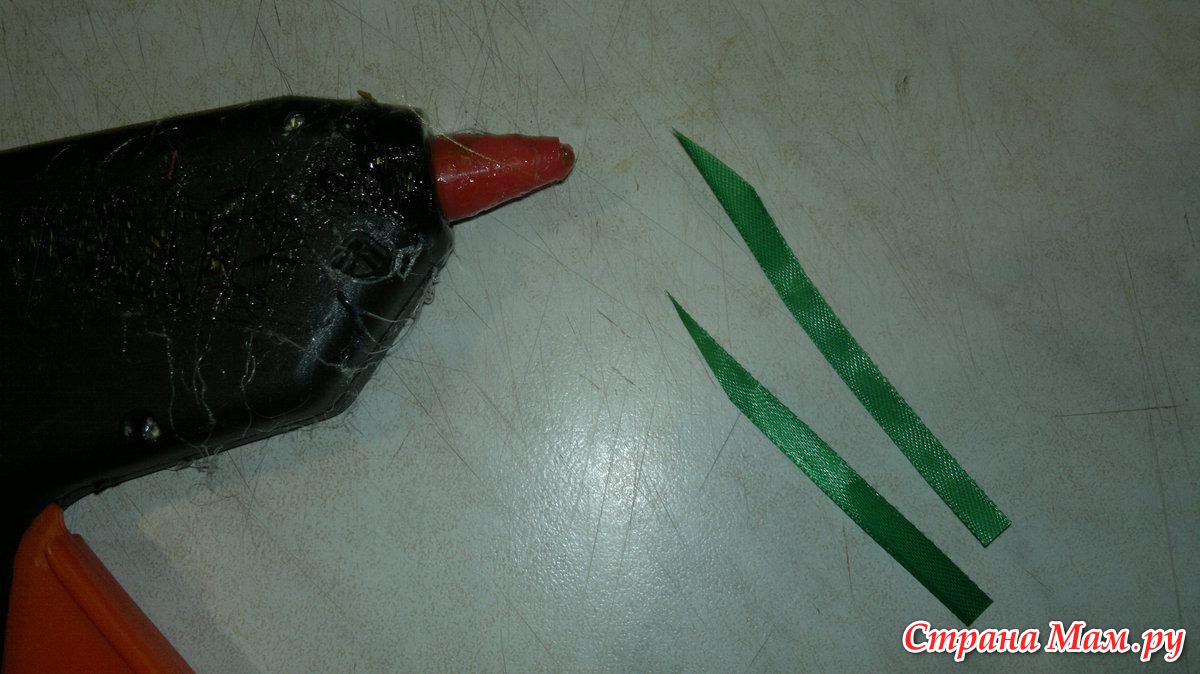 Нарезаем узкую зеленую ленту для лепестков(я предварительно побрызгала лаком для волос, чтобы они не сгибались)