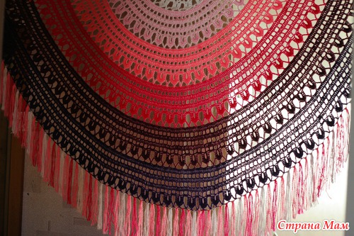 Вот. Перед Новым годом была сильно занята вязанием подарков для родни - и своей, и мужниной (фотки чуть позже выложу, потому как сестёр попросила сфотаться в новых шалях, и дать мне фотки, но пока их нет). А на каникулах взялась вязать наконец-то шаль и для себя. Решила полукруглую сделать. Вот что получилось.