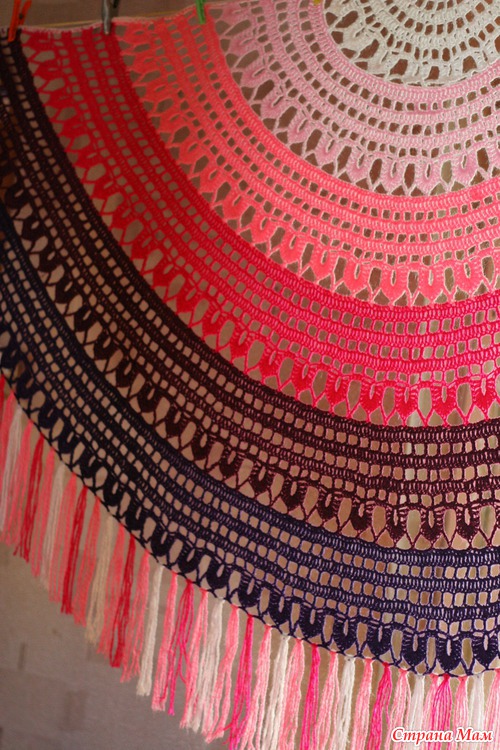 Делала по схеме китайского топа на основе полукруга, правда, там только первый ряд лепестков был (9 штук), дальше расчёты сама уже делала, чтобы на каждую новую цветовую дугу прибавлялось по 9 лепестков. Тогда ровно полукруг получается.