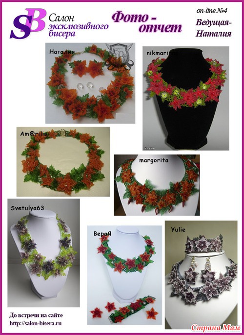 У нас прошел четвертый он-лайн. Теперь мы плели вот такое очаровательное колье. Но девчата увлеклись и создали комплекты.