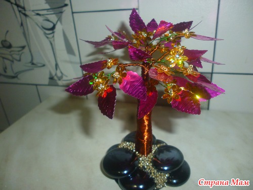 Веточки прикручены на деревянные шпажки и обмотаны проволокой,получился ствол.на маленькое зеркальце с помощью горячего клеевого пистолета все это приклеилось,камни тоже ...все пустоты тоже залиты клеем и на них сразу же бисер.раньше когда не было клеевого пистолета такие маленькие деревца клеила на прозрачный герметик или клей момент...