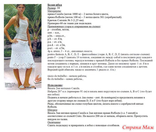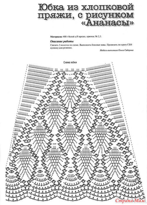 А я вязала белою юбочку с ананасным рисунком (третья сверху). Долго правда - брала тонкий крючок, и потом О УЖАС !сделала глупость - постирала в машине и выжала на режиме 1000 оборотов , а нитка - то 100% хлопок и такого издевательства она не выдержала и потянулась .А так красиво смотрелась!!!!!
