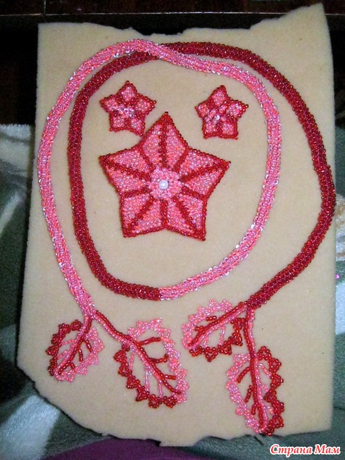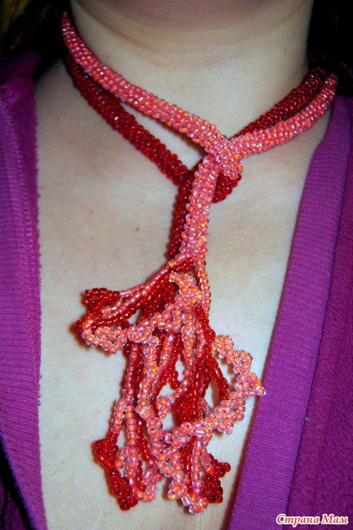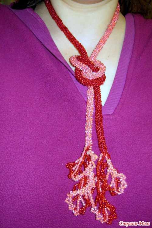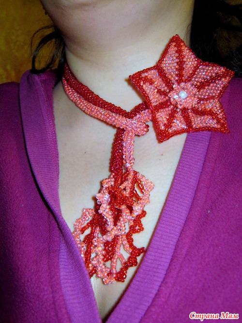 Итак, Розово-алый комплект включает в себя лариат, брошь и серьги. Общая длина лариата 115 см, 100 см жгут и 15 см подвски-листики.