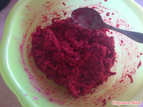 После того как мы хорошо перемешали творог со свеклой и остальными ингридиентами добавляем 1 ст. ложку оливкового (или подсолнечного) масла, у меня получилось 5 гр.