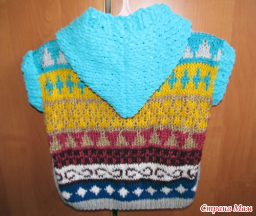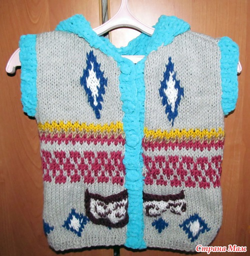 Как-то вечером, перелистывая старые журналы по вязанию, я встретила красивый жаккардовый узор с кучей элементов и сразу подумала о тех немногих оставшихся у меня маленьких моточков пряжи, и понеслось... Добавила на капюшон, и рукавчики плюшевую детскую пряжу. Парень до жилета пока не дорос, поэтому фото на плечиках.